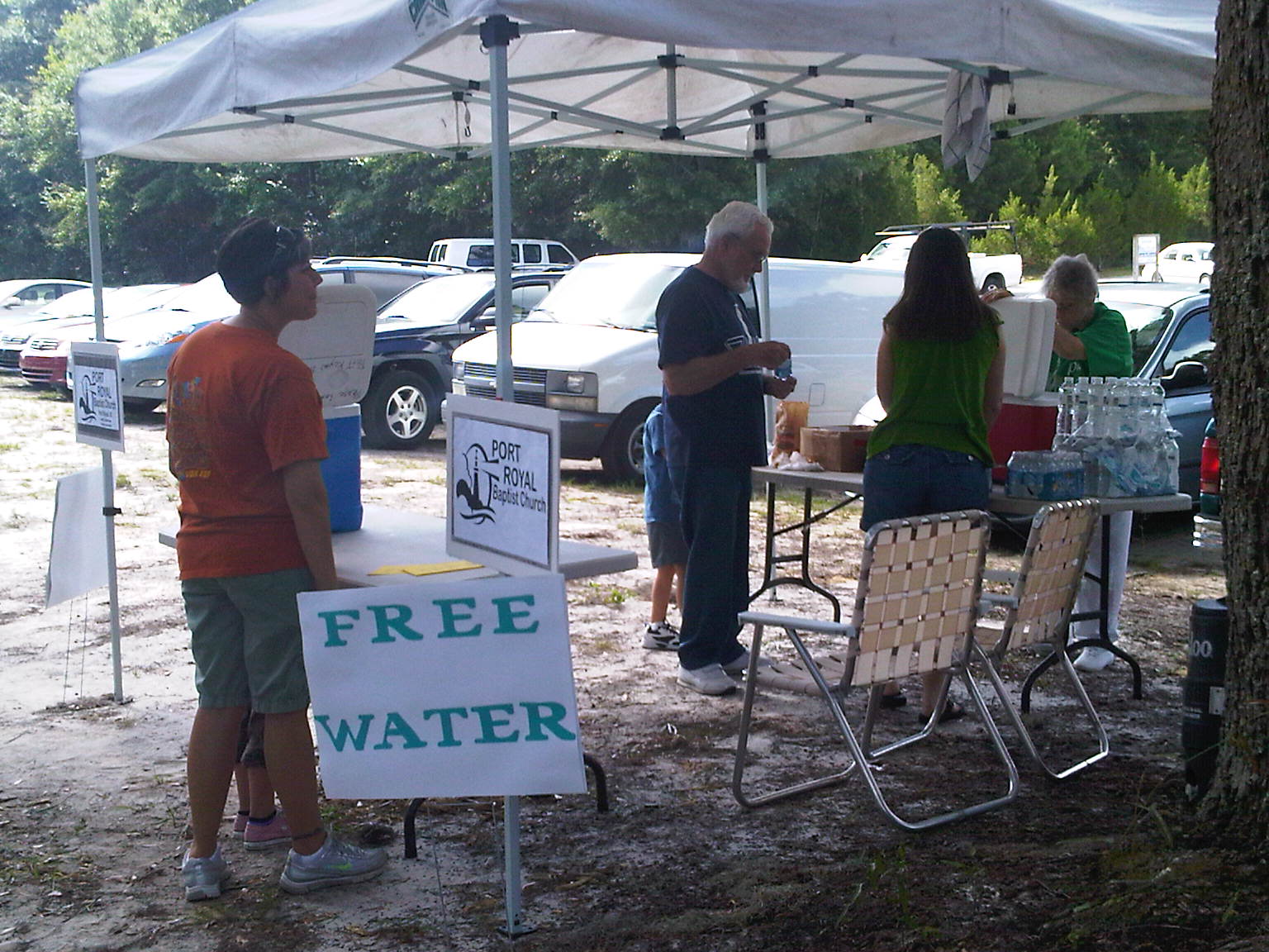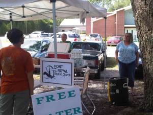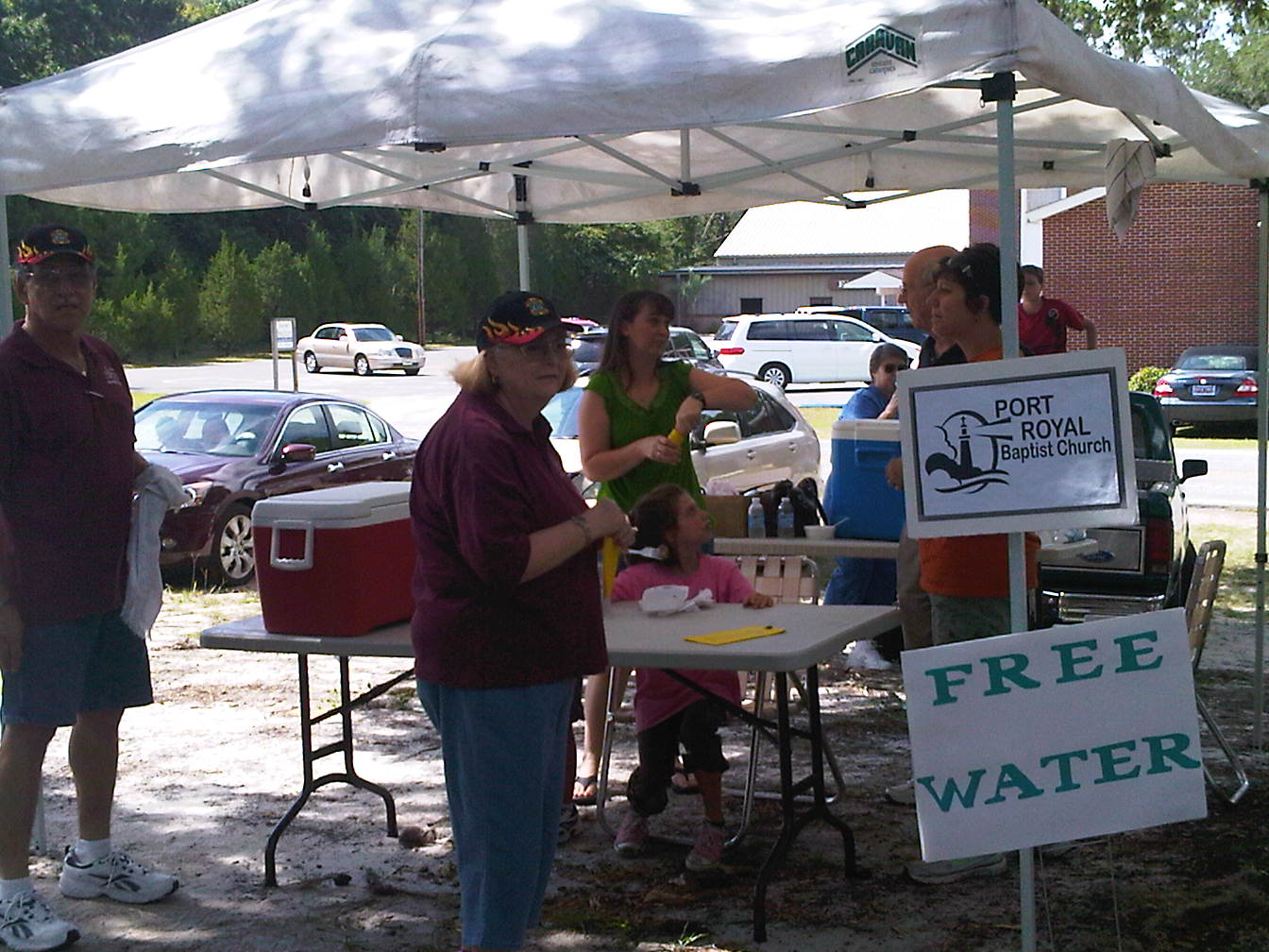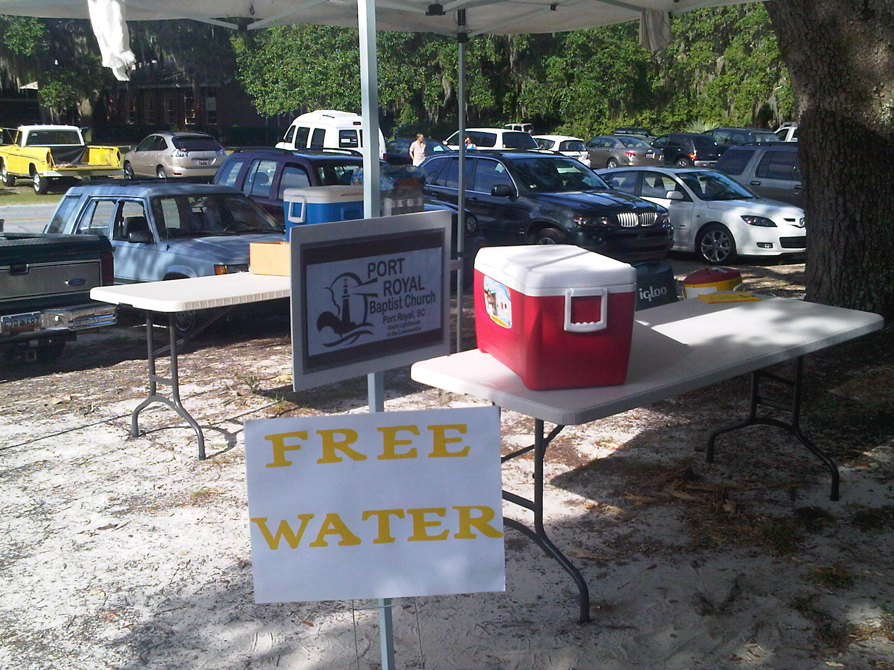 Today, Port Royal Baptist Church had the opportunity to minister to the people of Port Royal and Beaufort at the Farmer’s Market across the street from our church. This is the third time this summer that we have ministered there. Our goal in this project is simple: introduce ourselves to our community through servant ministry. We have chosen to give away free water. Through this approach, we as a church have been able to satisfy a need (thirst, who doesn’t like cold water on a hot day), while at the same time showing the love of Christ in a real and tangible way.